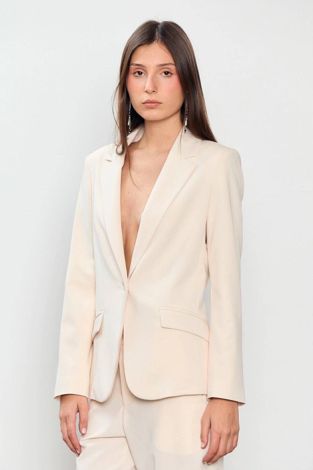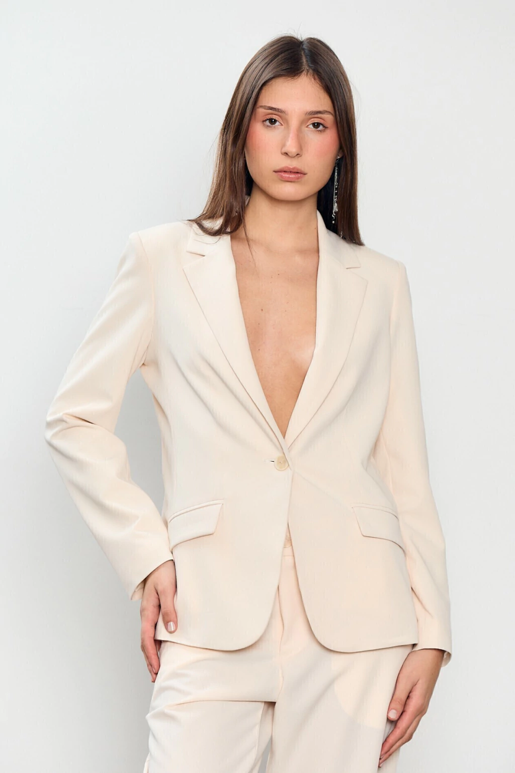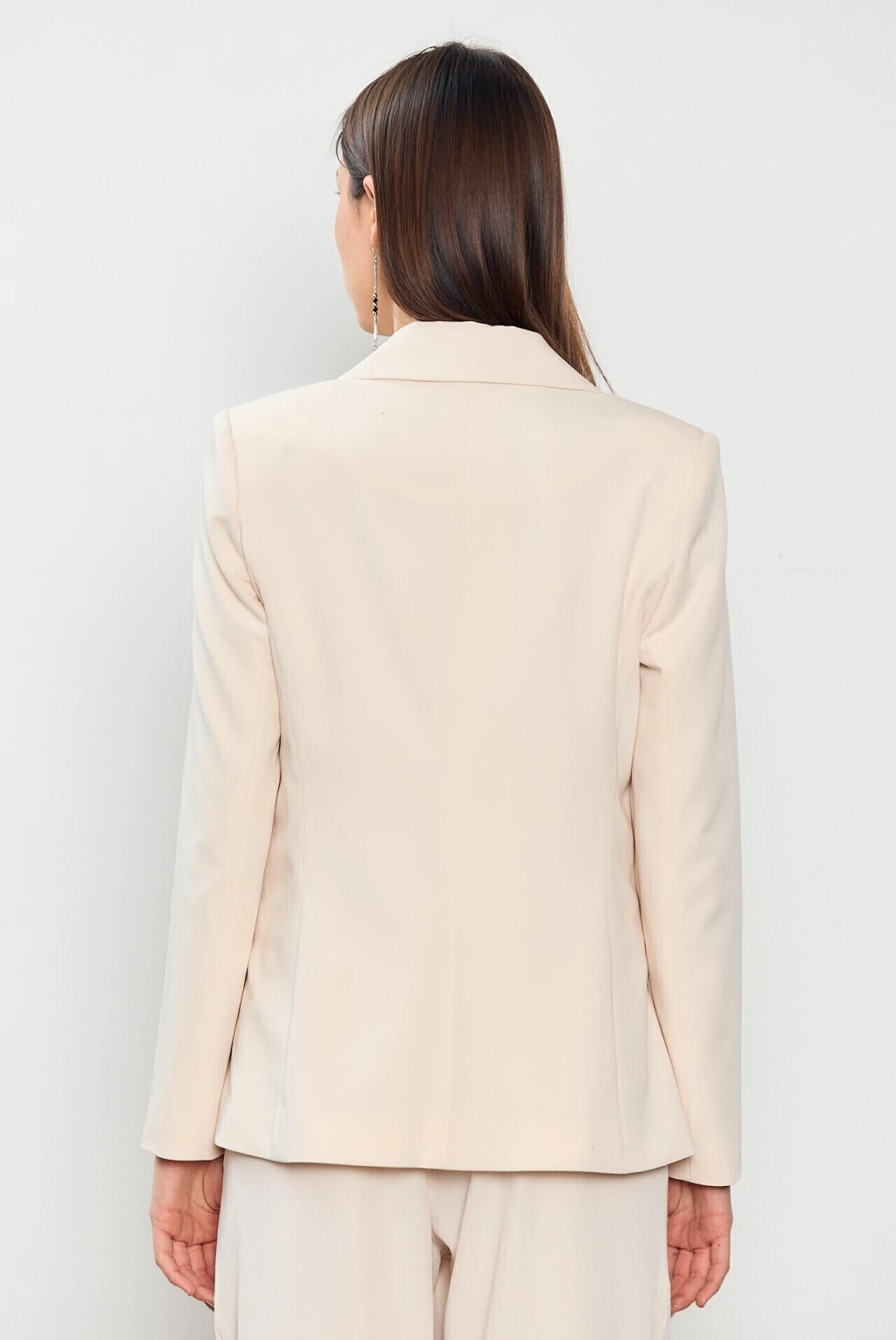 El Blazer Camelia está confeccionado en un género sastrero de excelente calidad, con una caída fluida y estructura firme que aporta elegancia sin sacrificar la comodidad. Tiene un calce entallado al cuerpo. El diseño cuenta con solapas clásicas, dos bolsillos con tapa funcionales en la parte frontal y forrería interna completa en satén.