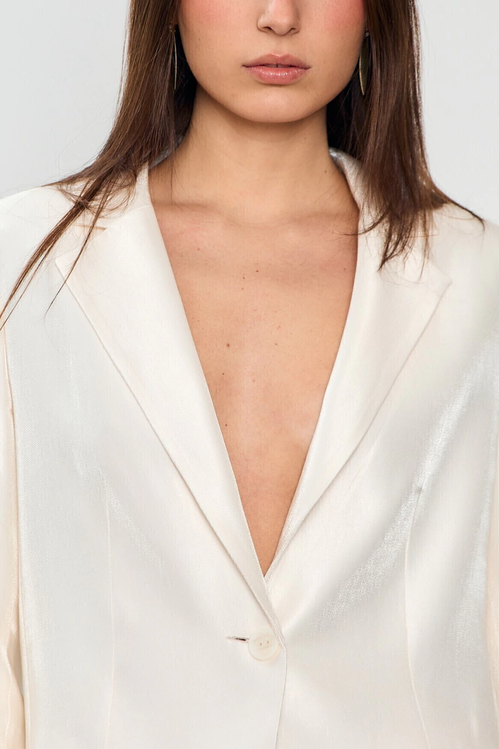 Está confeccionado en una tela que se destaca por su sutil brillo satinado, aportando un aire sofisticado y festivo, perfecto para un look cocktail. Con su corte corto tipo crop, este blazer resalta la silueta y añade un toque de tendencia a cualquier conjunto. Posee solapas clásicas y se cierra con un botón de pasta al tono.