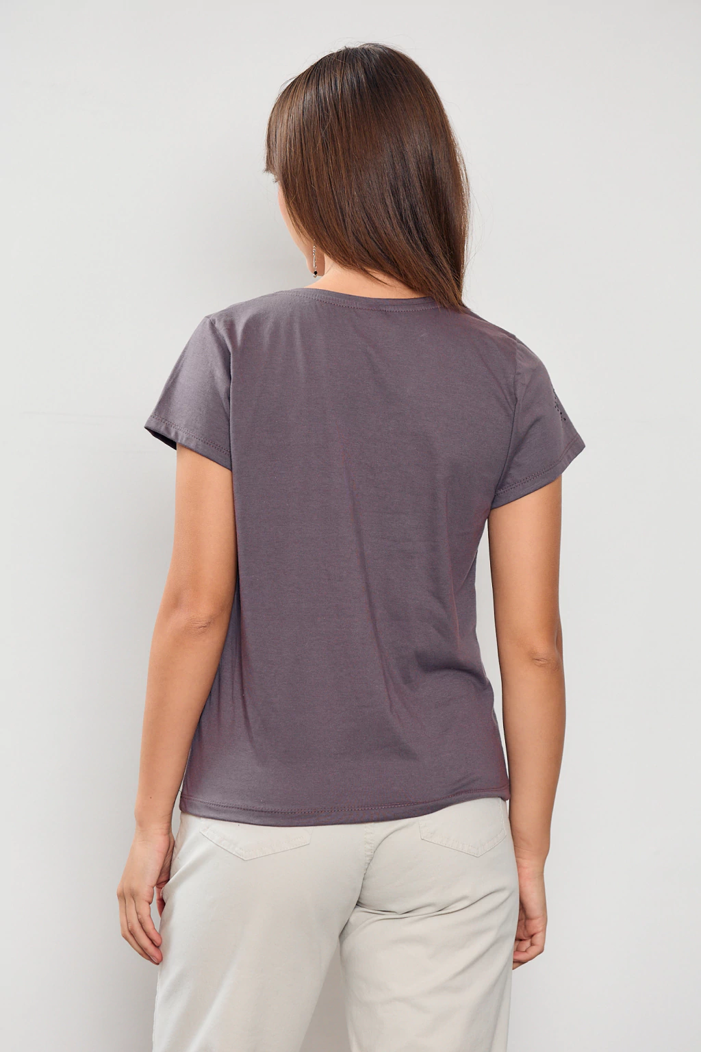 Remera escote en V con texto y estrella bordados. Versátil y combinable para un look de día! Composición: 100% Algodón.