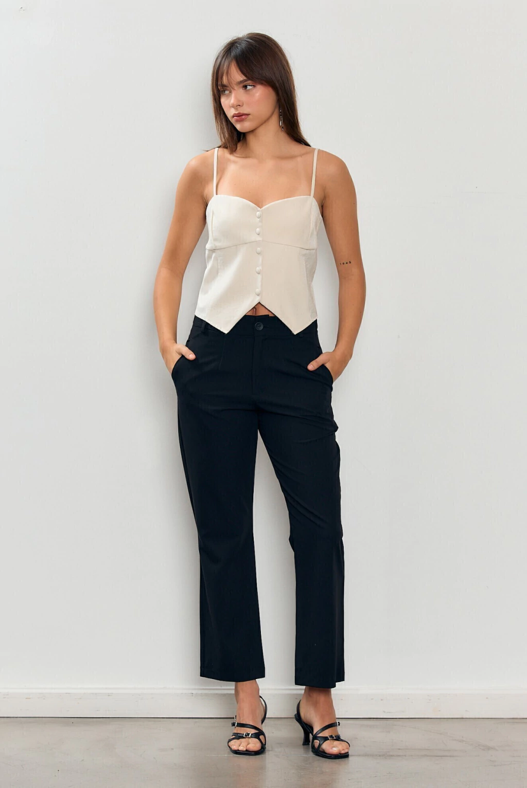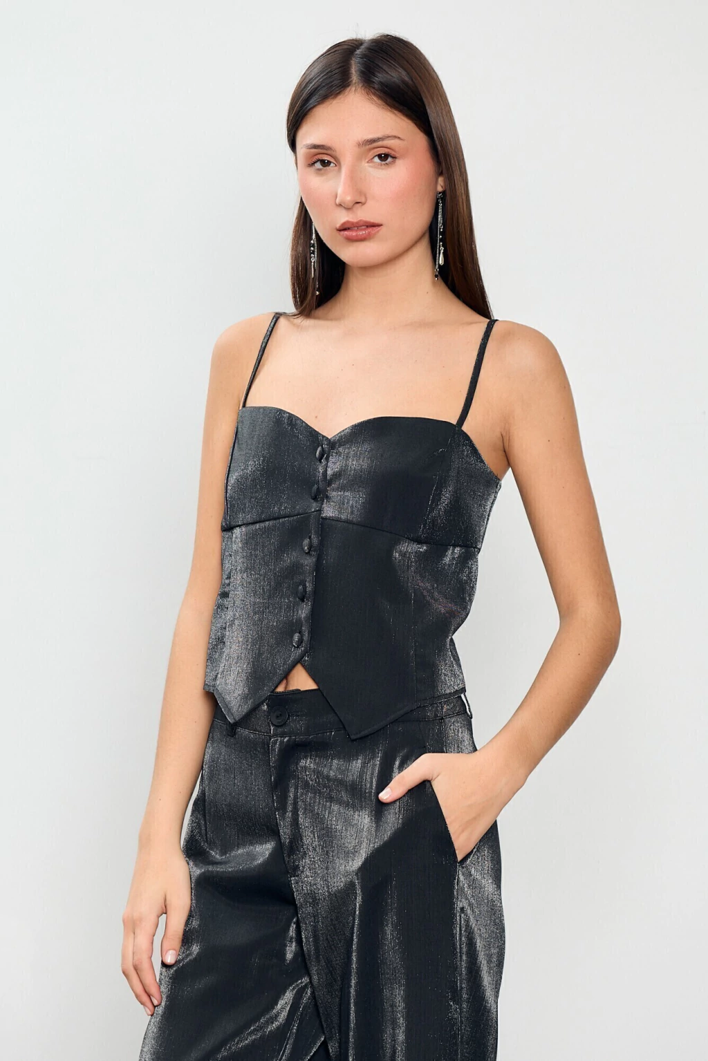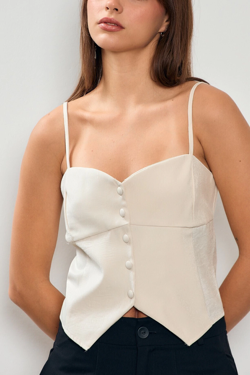 Presenta un escote corazón estructurado que realza el busto, breteles finos regulables y un diseño entallado que se acentúa con recortes verticales estratégicos. El detalle distintivo lo aportan los botones forrados en el delantero, un guiño delicado a la sastrería clásica que suma carácter y sofisticación.