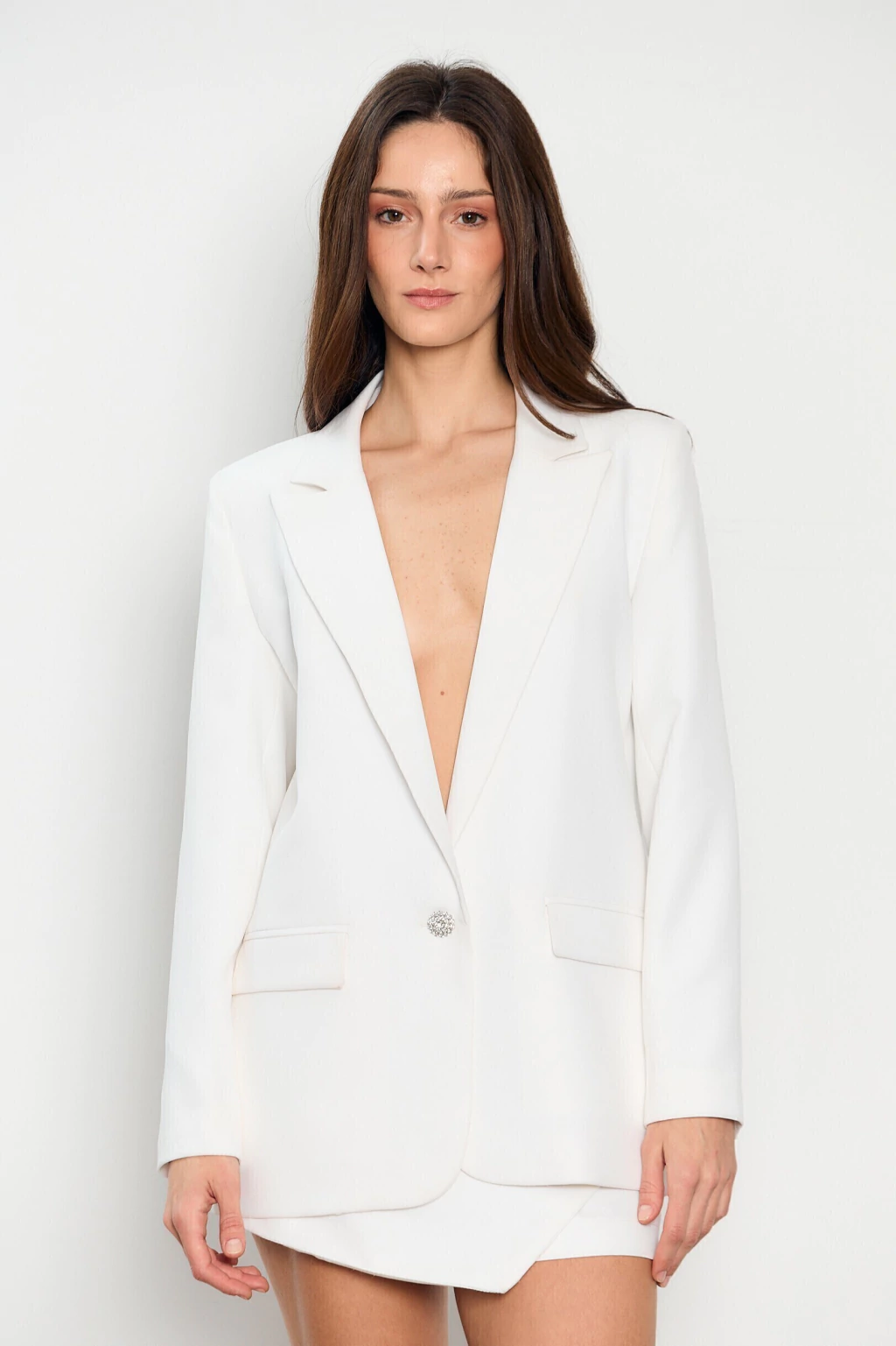 Está confeccionado en género sastrero con spandex, una tela con cuerpo, suave al tacto y con leve elasticidad que acompaña el movimiento sin perder estructura. De calce entallado, su silueta realza la figura de manera sutil, con solapas largas tipo smoking, bolsillos con tapa funcionales y cierre con botón de pasta al tono. Está completamente forrado.