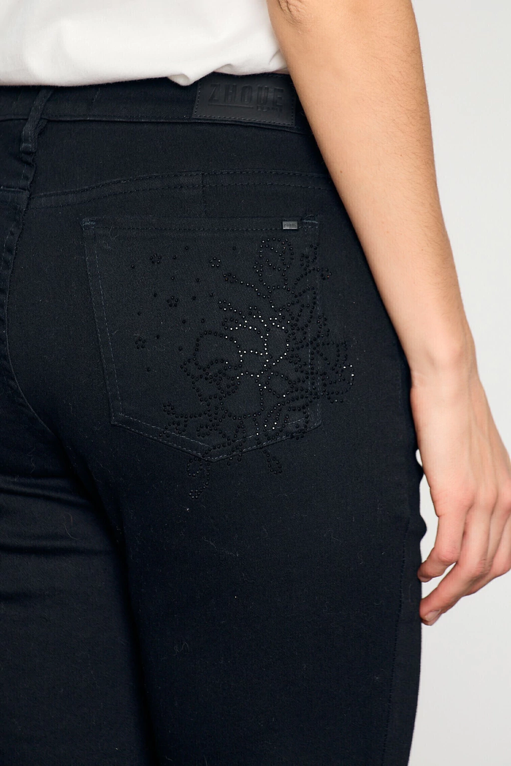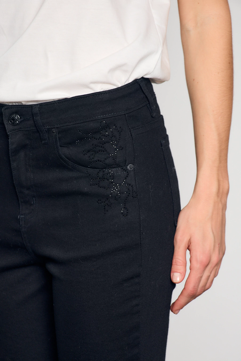 Confeccionado en denim elastizado color negro. Cuenta con un diseño unico en hotfix tanto en el bolisllo delantero como trasero, conviertiendolo en un basico para la noche. Su largo levemente acortado lo vuelve ideal para estilizar la figura.