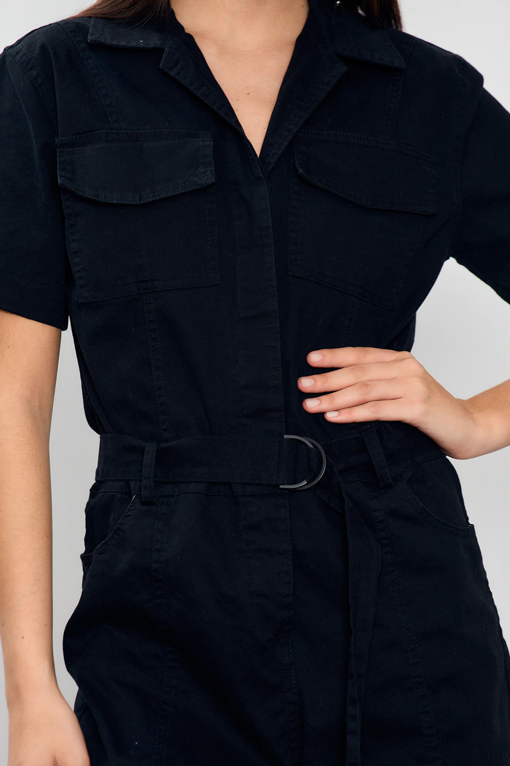 Mono corto recto de Gabardina. Cuenta con cuello camisero, acceso delantero con botones y cinto encomplemento de la misma tela con cierrede doble medialuna.